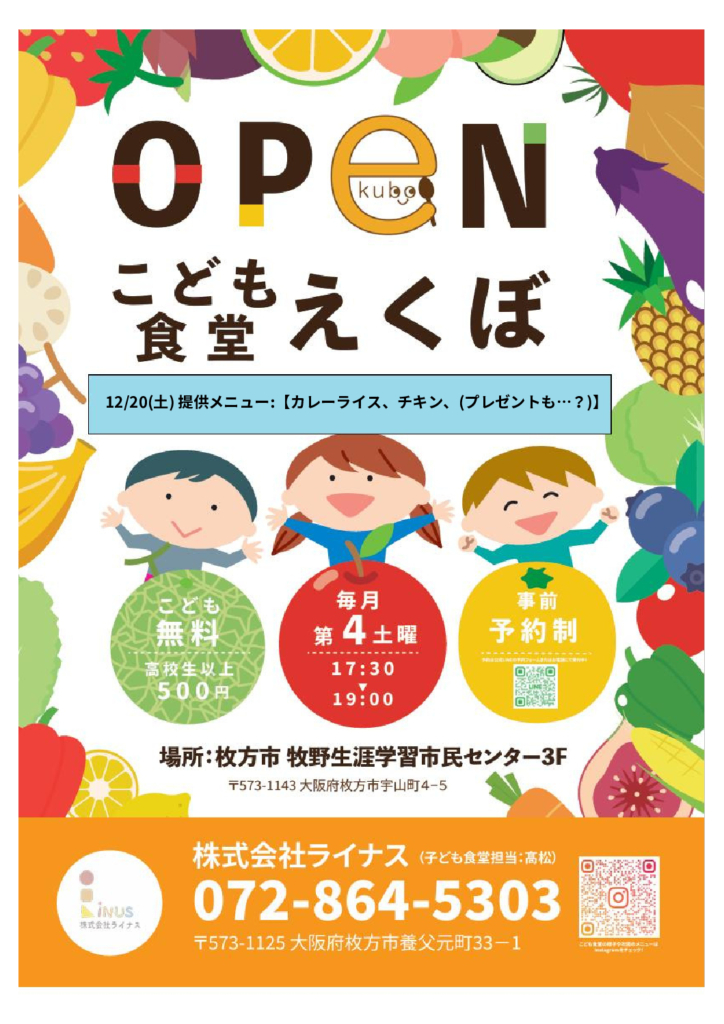 | お問合せ | 072-864-5303(子ども食堂担当:髙松) 〒573-1125 大阪府枚方市養父元町33−1 rainasu22@outlook.jp |